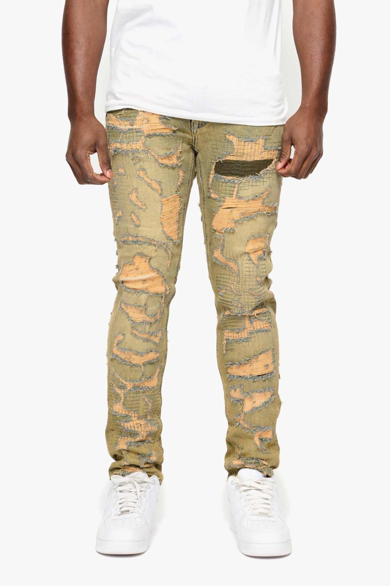 Go all in on bold style with ANOM SLIM FIT “TITANIC”— ( ANM165SF ) the ultimate statement jeans for those who aren’t afraid to stand out. Featuring heavy distressing and a unique olive-toned wash, these jeans fuse street-ready edge with all-day comfort.
