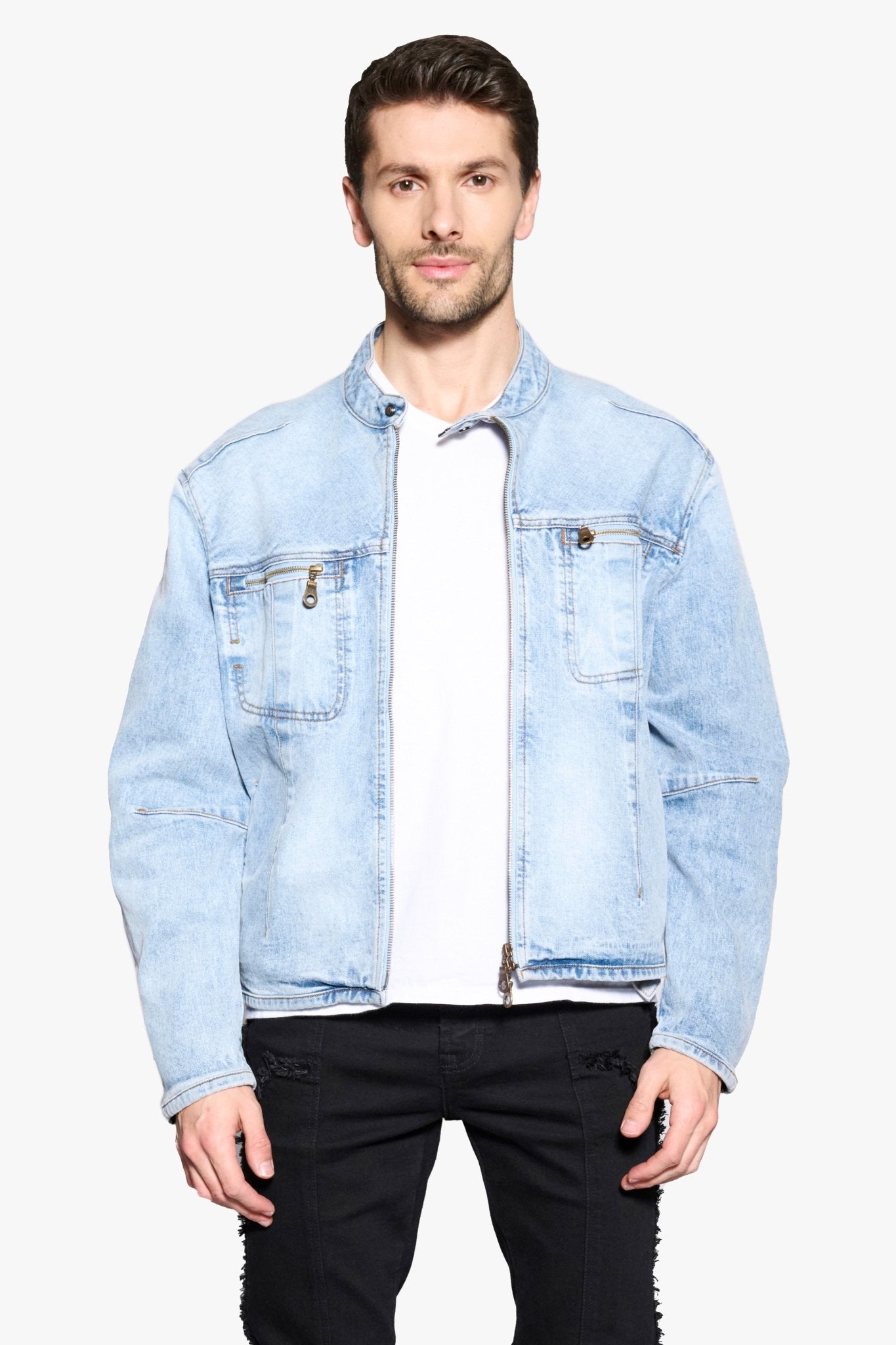 - Crafted from premium-quality denim, this jacket provides a comfortable fit with a durable structure. Details like a sturdy front zipper, minimalist collar, and side pockets enhance its functionality and sleek design. The light blue tone adds a crisp, airy vibe, effortlessly pairing with jeans, chinos, or joggers.